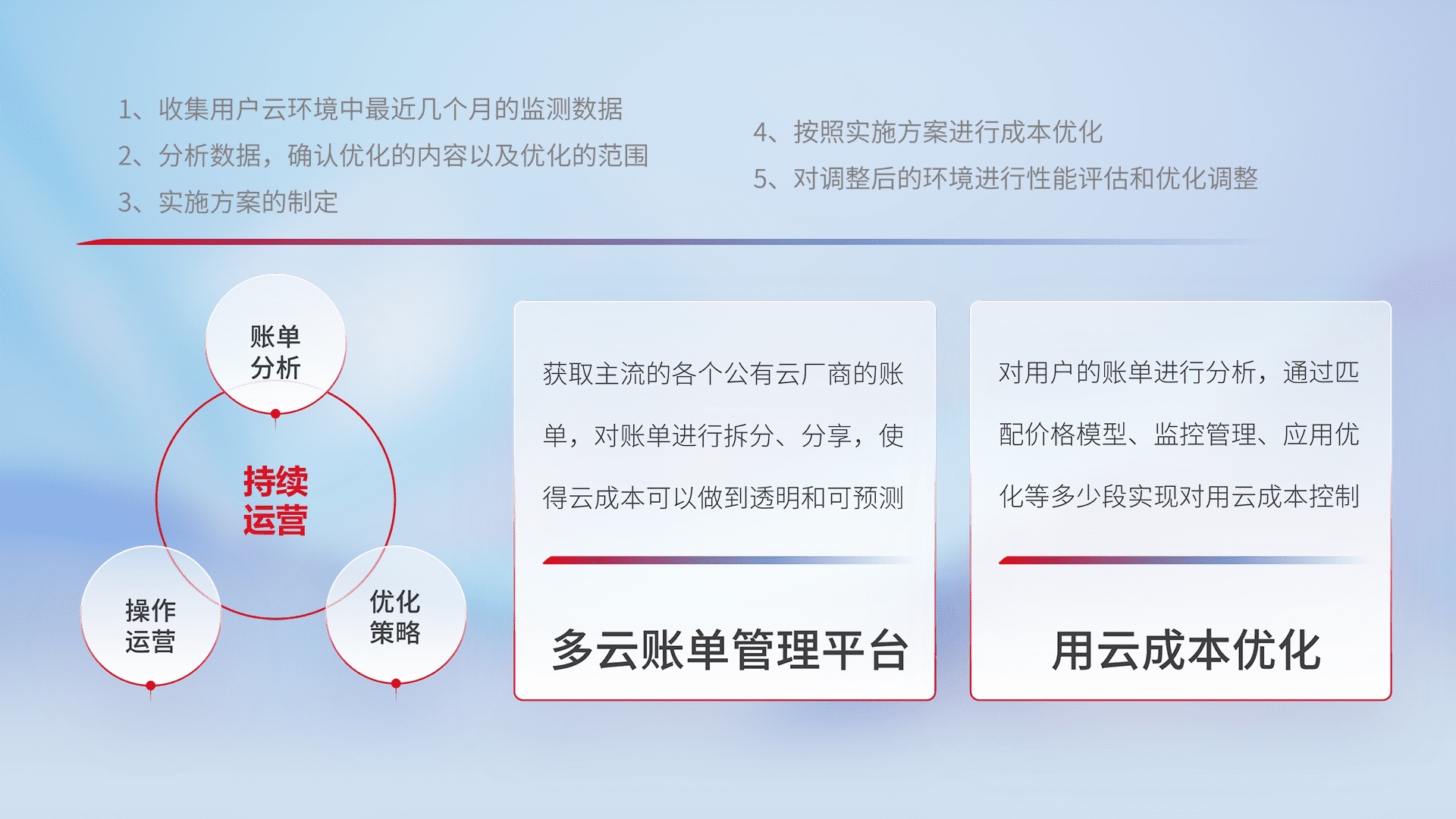 通过多云纳管,,,以统一的资源数据模型把客户的云资源进行抽象和封装,,,,进而实现对多云资源的统一操作,,保障云资源管理的可靠性、、、稳定性与可用性。。。量身定制化运维内容,,配置、、、、开发运维、、、、补丁管理、、、、备份、、、监控、、认证和访问管理、、审计和日常巡检等,,保障在用云过程中的可靠度,,稳定度以及高可用率。。。。