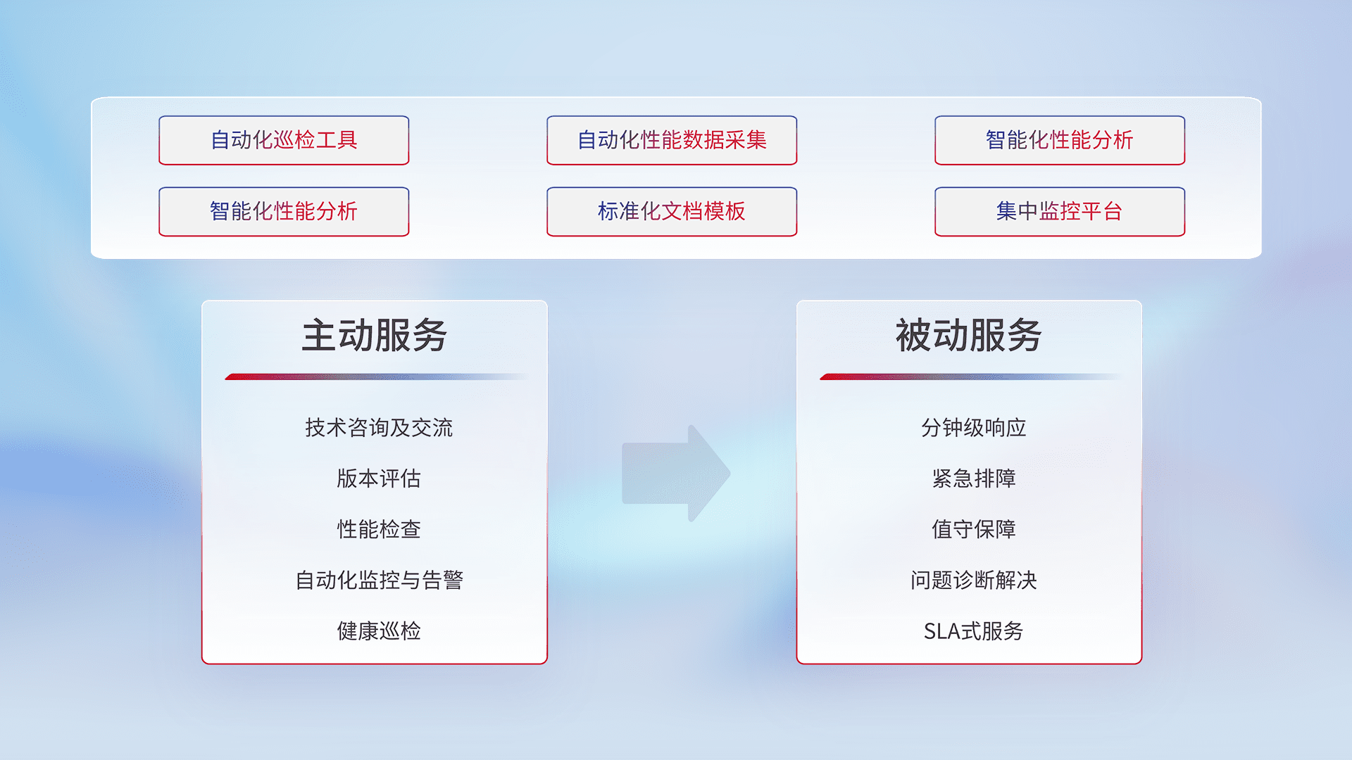 智能化工具和标准化文档,,,保障服务质量,,,提供主动服务(包含技术咨询、、、版本评估、、、、性能检查、、、自动化监控与告警、、、、健康巡检)和被动服务包含(分钟级响应、、、、紧急排障、、值守保障、、、问题诊断解决、、、、SLA服务)。。。