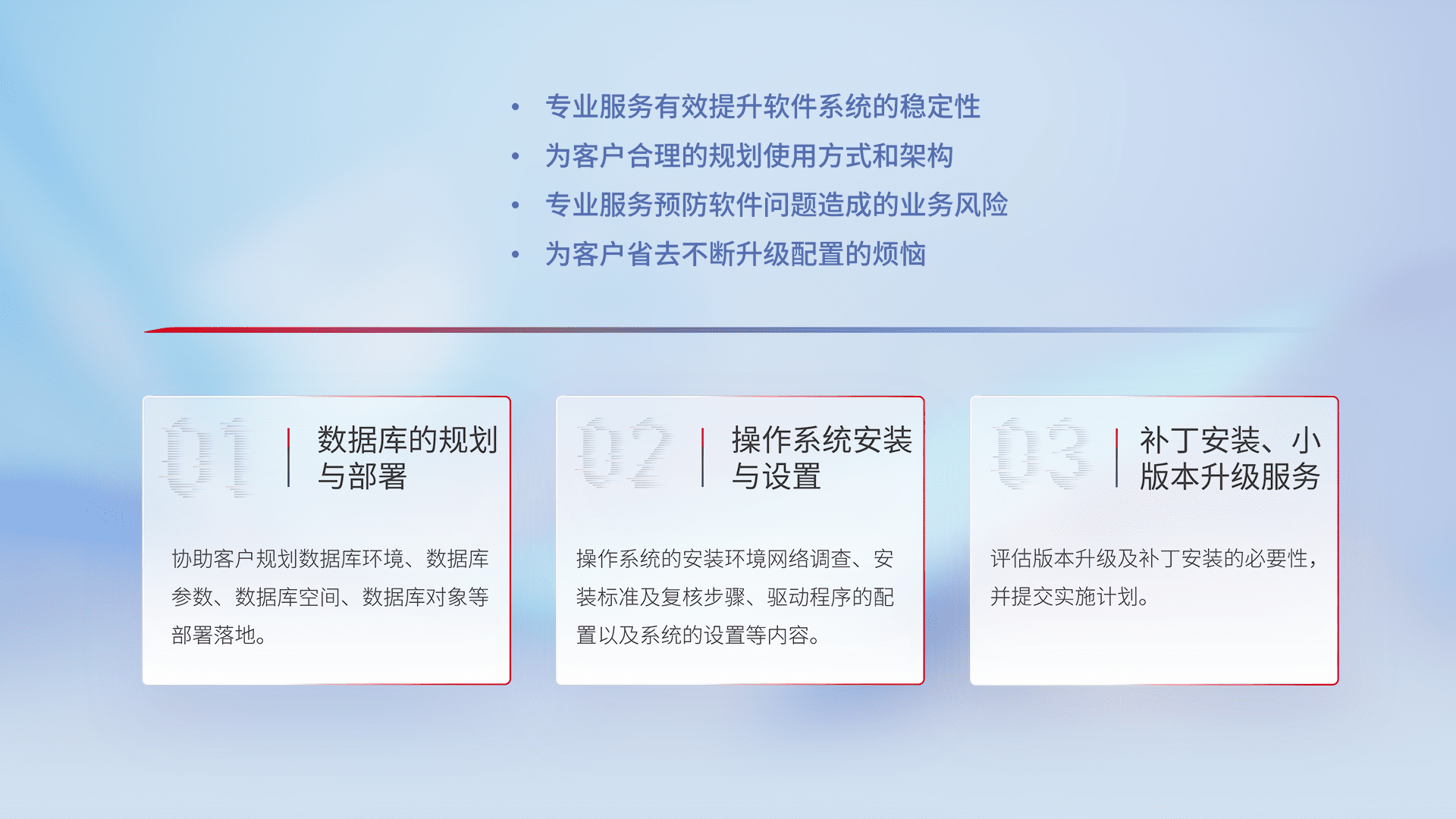 为客户提供软件规模升级、、、快速部署、、、、按需配置的专业服务,,,,从数据库的规划与部署到操作系统的安装与设置,,,再到补丁安装和小版本升级提供支持。。